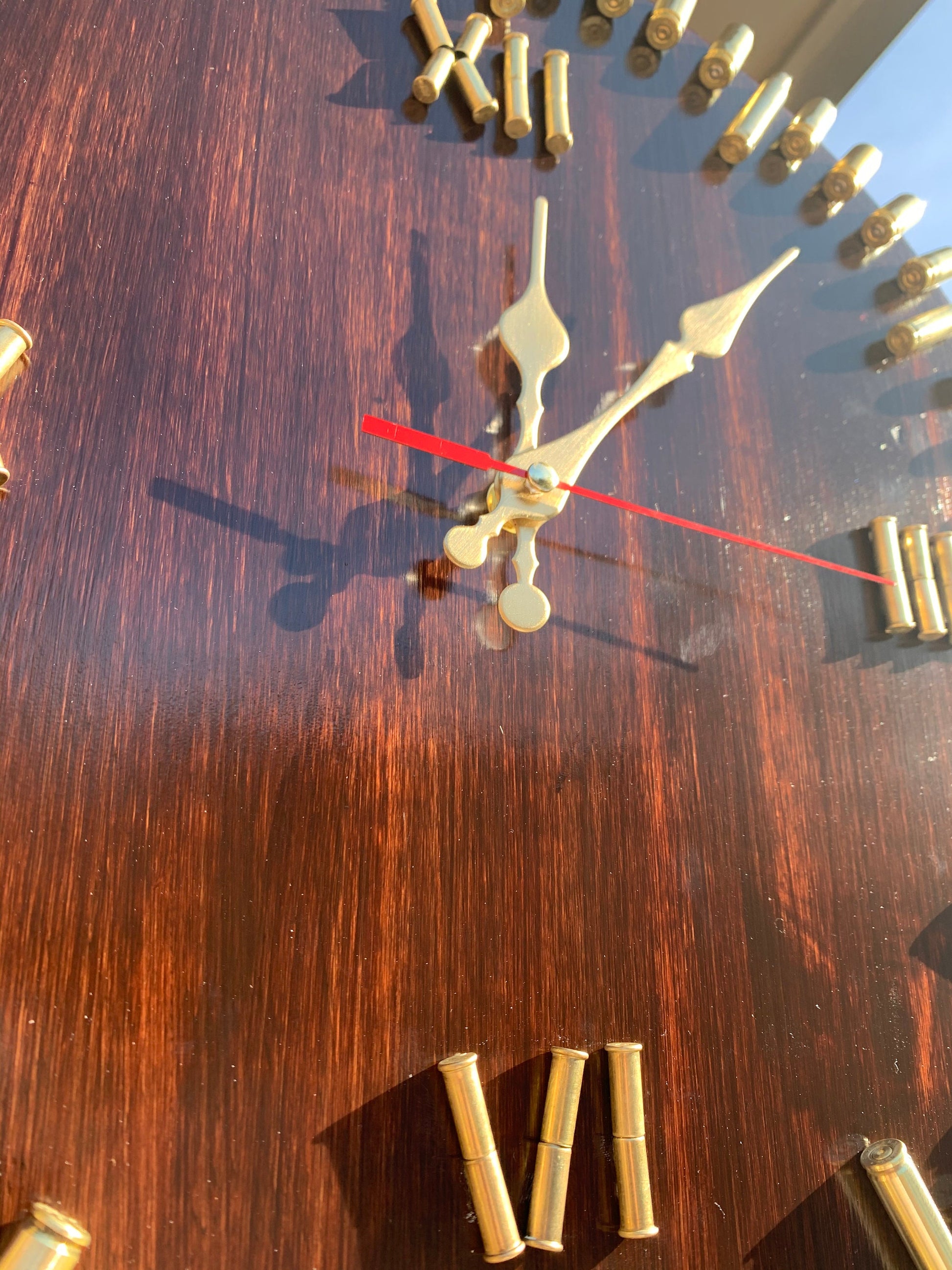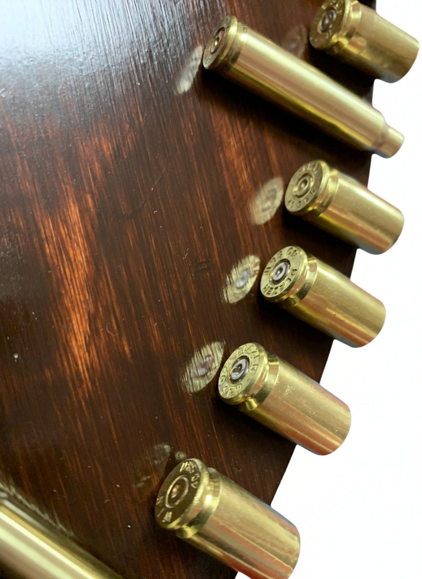 A striking combination of craftsmanship and bold design. This handmade 14” clock features a deep, rich wood finish accented with authentic spent brass shell casings marking each hour. Polished Roman numerals and ornate clock hands add a timeless, classic touch — blending elegance and grit into one powerful piece.