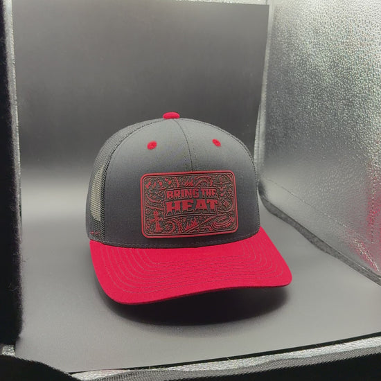 This hat features a laser-engraved leatherette patch with the words “BRING THE HEAT” set in bold lettering and framed by intricate fire-inspired linework. The black crown and red bill create a strong, unmistakable firefighter colorway, photographed inside a firehouse with turnout gear hanging in the background — a setting that speaks for itself.