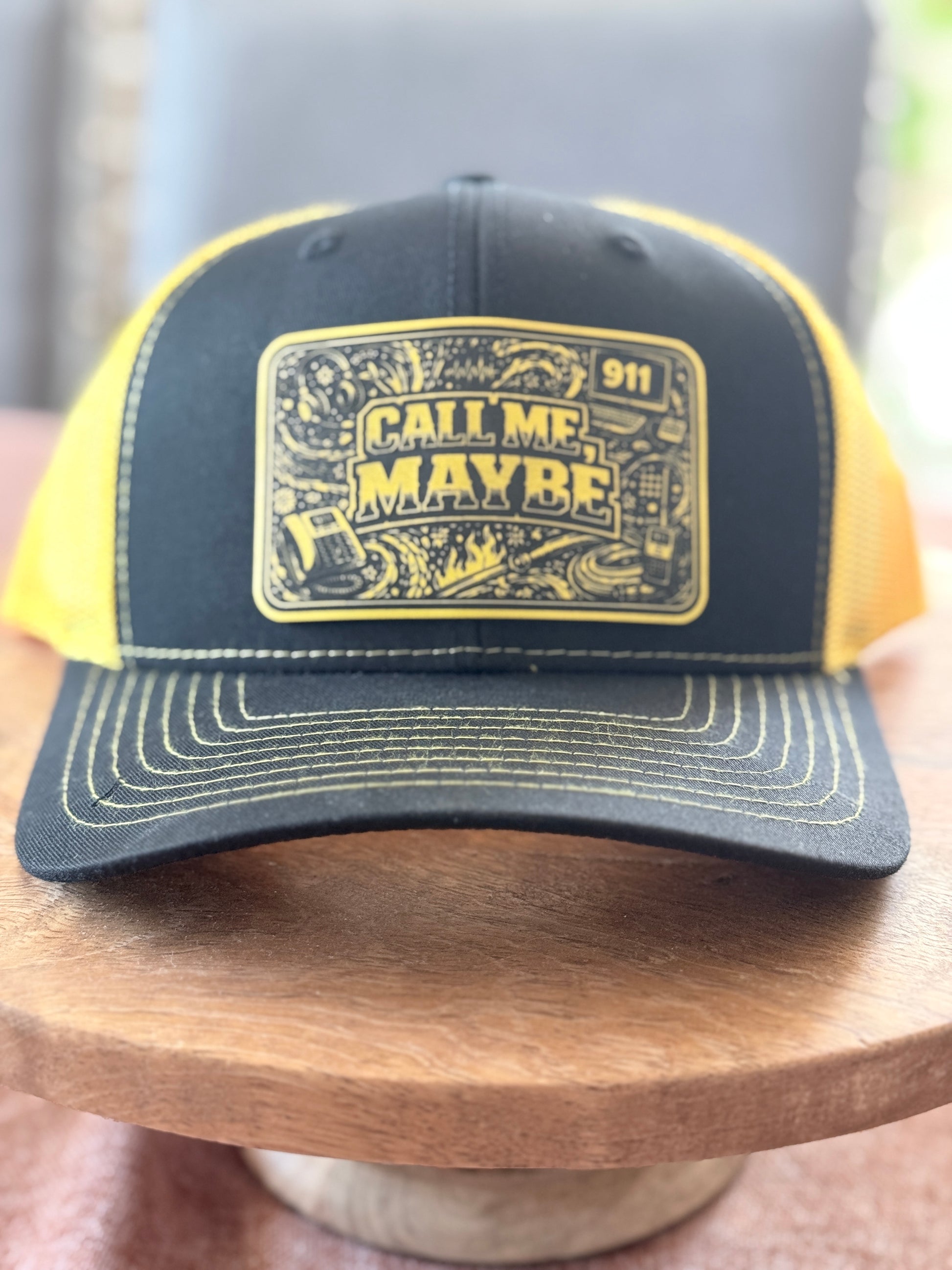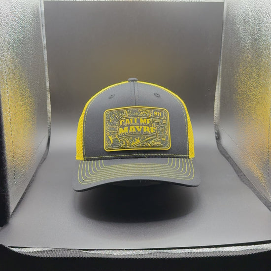 Featuring a laser-engraved leatherette patch with the phrase “Call Me, Maybe” and subtle 911-inspired design elements, this hat captures the reality of dispatch life: constant communication, split-second decisions, and steady focus under pressure. The black front panel paired with high-visibility yellow mesh delivers both contrast and function, while the dispatch-center backdrop reflects the environment this design represents.